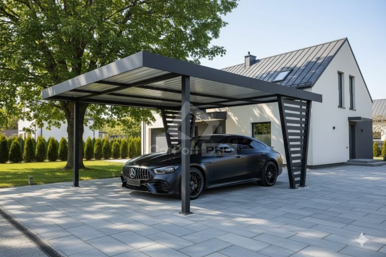 Carporty stalowe to praktyczne i trwałe rozwiązanie dla ochrony samochodu przez cały rok. Solidna konstrukcja zapewnia doskonałe zabezpieczenie przed śniegiem, wiatrem i intensywnymi opadami deszczu. Zabezpiecza także przed gradem, opadającymi liśćmi czy żywicą spadającą z drzew i odchodami ptaków. Carport chroni samochód przed promieniowaniem UV, które powoduje blaknięcie lakieru i niszczenie elementów wnętrza. Dzięki temu samochód jest mniej podatny na uszkodzenia i zabrudzenia a codzienne użytkowanie staje się wygodniejsze.