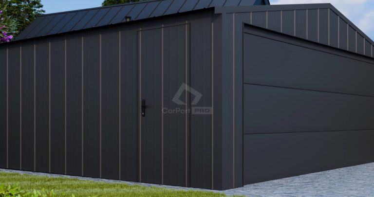 Garaż blaszany 5×4 – brama segmentowa – drzwi – blacha na rąbek – dach dwuspadowy CP144